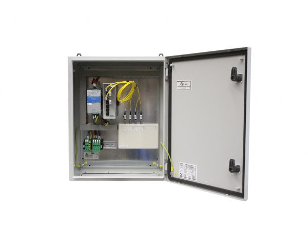 Metal cabinet IP65 for junction and power supply 96-264Vac 50/60Hz, 12Vdc@1,5A. Complete with selectable terminal for power input. Ethernet Rj45 signal socket, patch box for fiber optic termination complete with q.ty 2 ST or SC single mode or multimode type connector (to be specified in phase of order). Expandable up to 6. Equipped with surge protection network and short circuits. Metal painted sheet case in RAL7035, complete with wall mounting accessories. Dimensions: approx 400x300x150mm. Cable entry/output at customer charge.