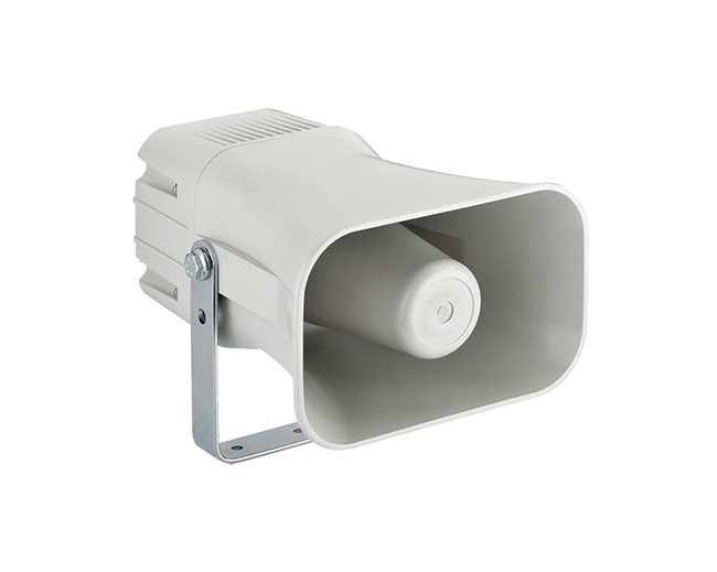 Horn speaker certified EN54-24, weatherproof, IP66. Passive, audio output 100V, power (RMS): 15/7.5/3.75W. Sensitivity: 110dB/W/m, with 110°H-55°V beam angle. Frequency range: 350-10.000Hz. Made of ABS, UL 94V-0. Supplied with mounting bracket. Operating temperature: -25°/+70°C. Dimensions: 180x120x230mm.